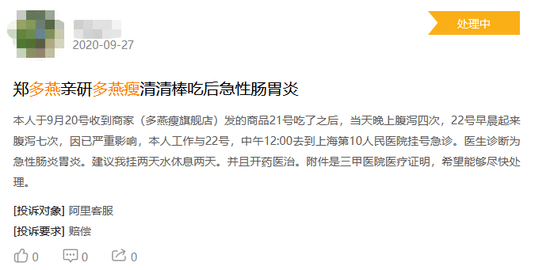 值得一提的是,在黑猫投诉公开信息中,有消费者食用多燕瘦旗舰店发出的产品后,出现严重腹泻十余次,被三甲医院急诊科医生诊断为“急性胃肠炎”。