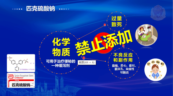匹克硫酸钠是一种药品原料,具有缓泻作用,属于非食用物质,在常规标准检测中无法检出。且具有明显的不良反应和副作用,必须凭处方、遵医嘱才能使用。