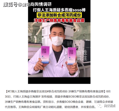8月30日,职业打假人王海发布测评视频,由金星、张天爱、谢娜、汪涵、张馨予、李小冉等明星带货产品“多燕瘦”,存在非法添加新泻药成份——双丙酚丁。