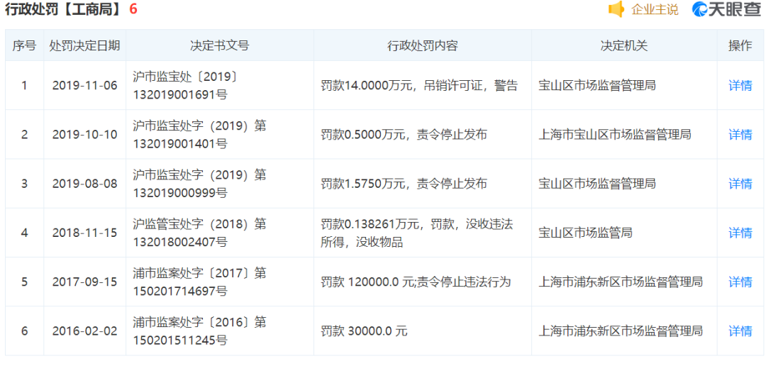 除了吊销食品经营许可证,蜂了时尚科技(上海)有限公司还因虚假宣传多次被罚款,如2019年10月10日,其持股49%的多燕瘦减肥服务(上海)有限公司在拼多多店铺销售吸油丸T M(益生菌水果味片)、清清梅(酵素青梅)普通食品时,委托他人设计制作并发布了“排油润肠”、“轻松减脂”、 “清肠排毒通便秘”等保健功能宣传广告,最终被上海市宝山区市场监督管理局罚款5000元。更值得注意的是,从2016年2月2日,该公司就多次因各种广告违法行为遭到上海市场监管部门的罚款多达7次,累计罚款37.5万元。