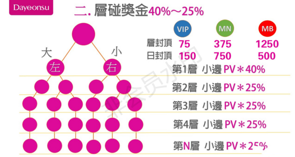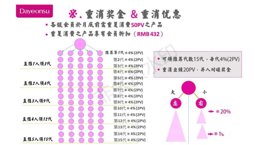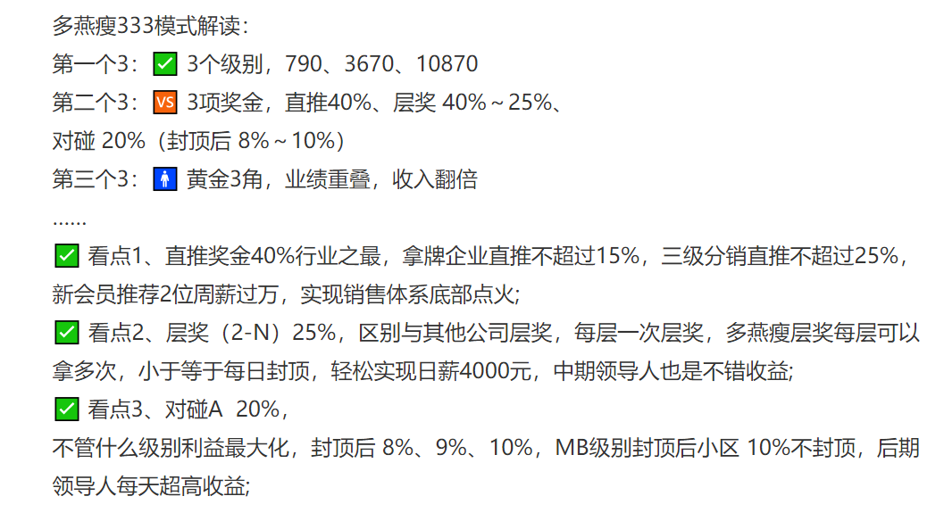 社交财经注意到,多燕瘦如今已进军社交电商行业。其商业模式如下:根据不同的消费金额分为VIP会员、区域经理、行动大使三个级别;可获得40%的推荐奖金、层碰奖金分为左右大小两个区,获得40~25%的奖励;另有对碰奖金10~20%,可拿无限代;重销奖金和重销优惠:直推1人领3代、直推2人领6代、直推3人领9代、直推4人领12代、直推5人领15代,呈金字塔结构进行发展。每笔奖金拨放80%为现金点、20%为活动点数。