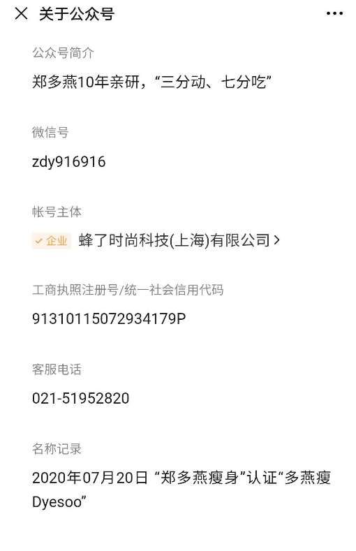 社交财经还注意到,在微信公众号名为“多燕瘦”上仍宣传:郑多燕10年亲研,“三分动、七分吃”的简介。该公众号账号主体是蜂了时尚科技(上海)有限公司。