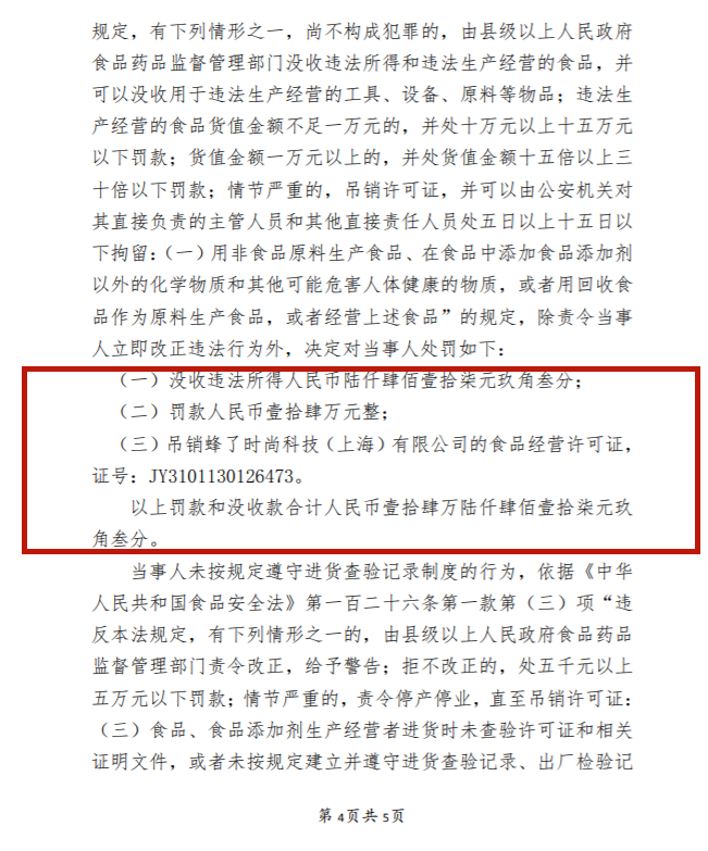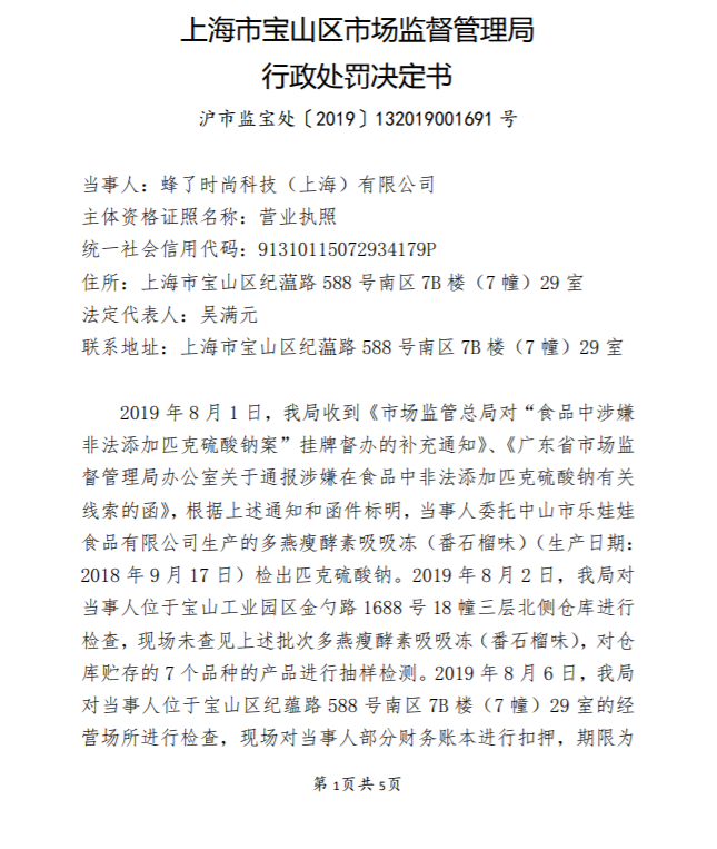 此外,社交财经还注意到,蜂了时尚科技(上海)有限公司因“生产经营添加食品添加剂以外的化学物质和其他可能危害人体健康物质生产的食品”被上海市宝山区市场监督管理局罚款14万元与吊销食品经营许可证。