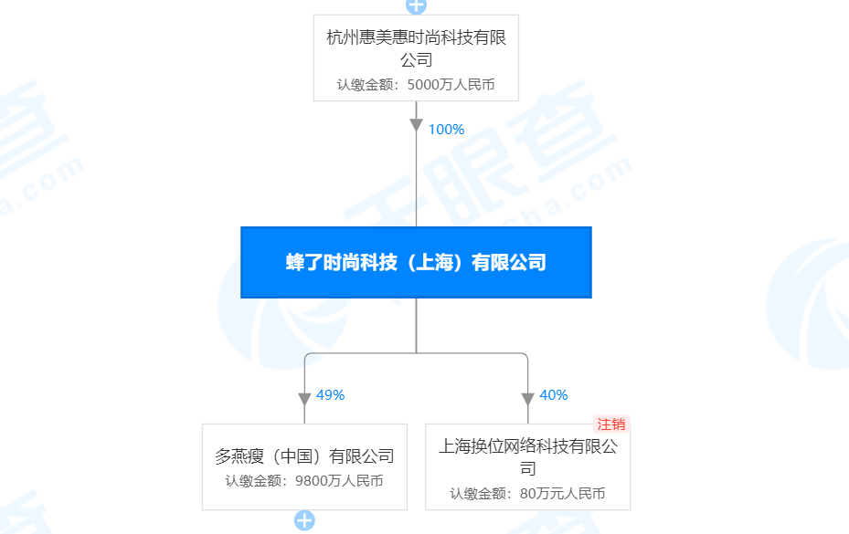值得注意的是,2019年8月19日,该公司由“多燕瘦减肥服务(上海)有限公司”变更为“蜂了时尚科技(上海)有限公司 ”,法人代表由“文艺”变更为“吴满元”。
