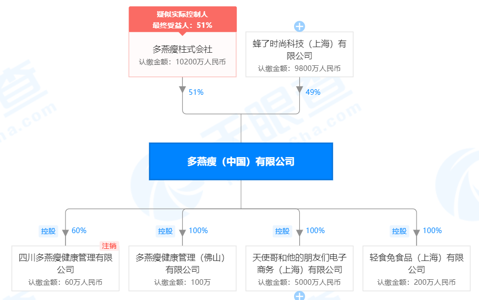 据天眼查APP显示,多燕瘦(中国)有限公司成立于2017年6月30日,实缴资本为2000万元,吴满胜担任董事长,吴满元担任董事兼总经理。该公司最大股东是多燕瘦柱式会社,持股51%,蜂了时尚科技(上海)有限公司持股49%。