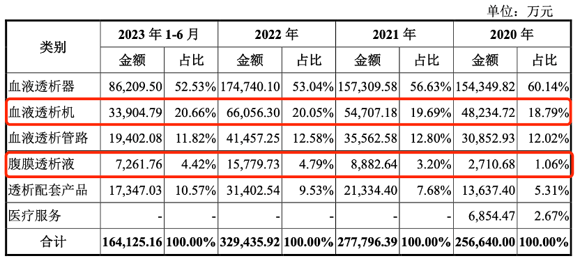 2020年-2023年上半年,威高血净来自血液透析机及腹膜透析液销售收入分别为5.09亿元、6.36亿元、8.18亿元和4.12亿元,占公司主营业务收入的比例分别为19.85%、22.89%、24.84%和25.08%。