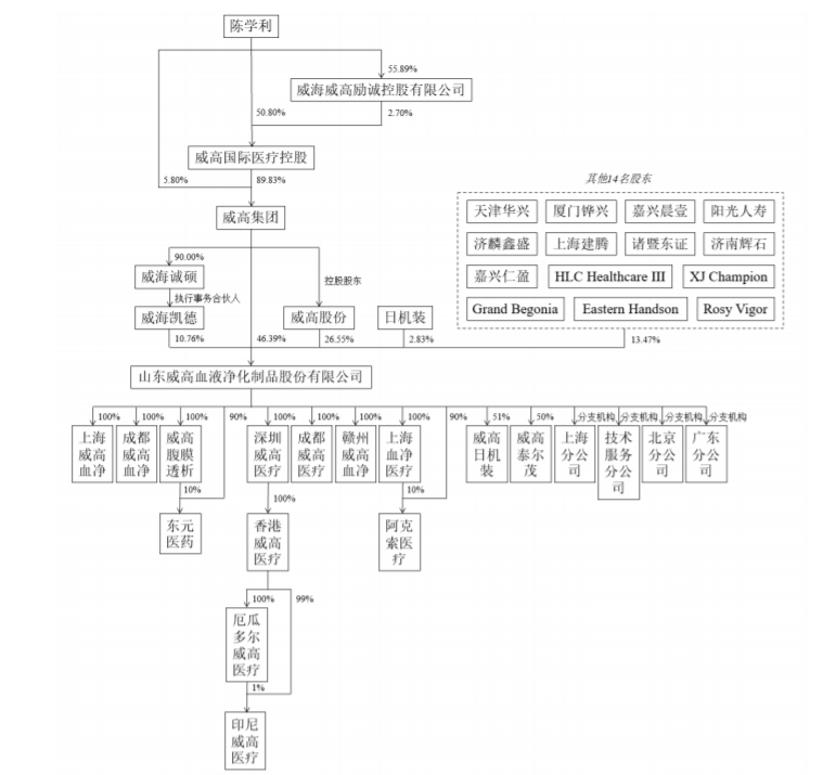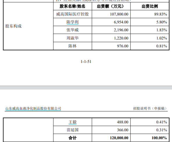根据招股书,威高集团由威高控股持股89.83%,由陈学利持股5.8%,由张华威持股1.83%,由周淑华持股1.02%,由陈林持股0.81%,由王毅持股0.41%,由苗延国持股0.31%。