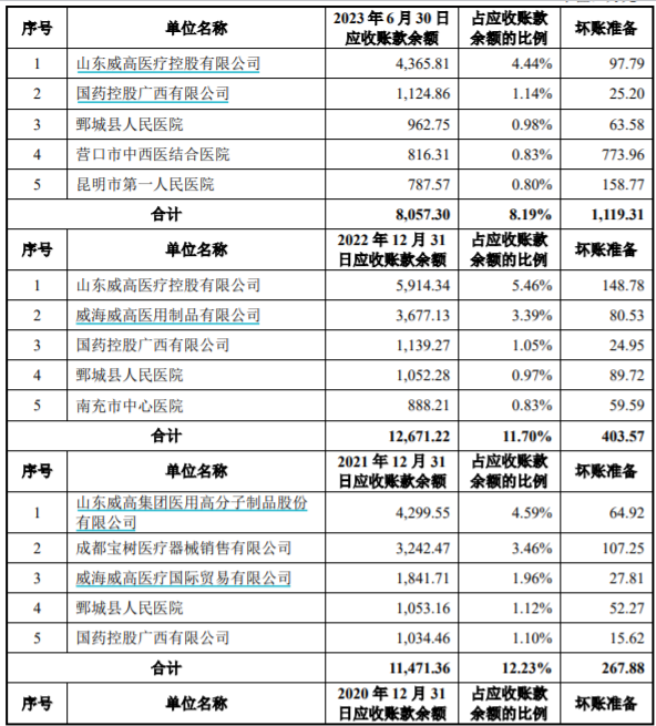 同时,威高系公司威高股份、威高医疗都曾位列威高血净应收账款前5名客户中的榜首。2020年及2021年,威高血净应收威高股份账款分别为6498.09万元、4299.55万元;2022年及2023年上半年,威高血净应收威高医疗账款分别为5,914.34万元、4,365.81万元。