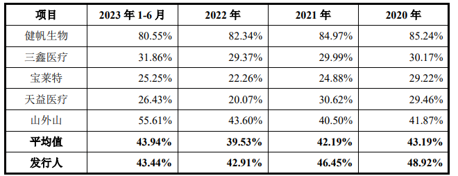 不过报告期各期,对比同行业可比上市公司血液净化业务的毛利率,可以看到威高血净综合毛利率水平要高于行业均值,其表示与各家公司的毛利率水平差异主要来源于不尽相同的血液净化业务结构。