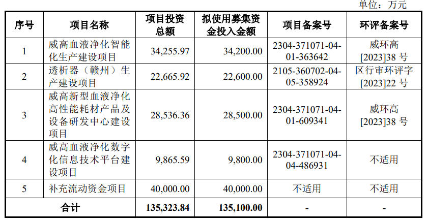 威高血净此次募资金额为13.51亿元,其募资投资项目具体如下: