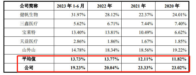 报告期各期,威高血净期间费用占营业收入比例分别为33.45%、35.63%、31.41%以及27.91%,其中,销售费用的营收占比分别为23.02%、23.33%、20.04%和19.23%,能看到2022年度其销售费用增速放缓,但销售费用率要远高于同行业可比上市公司均值。对此威高血净则归因于公司间业务类型及产品结构的差异。