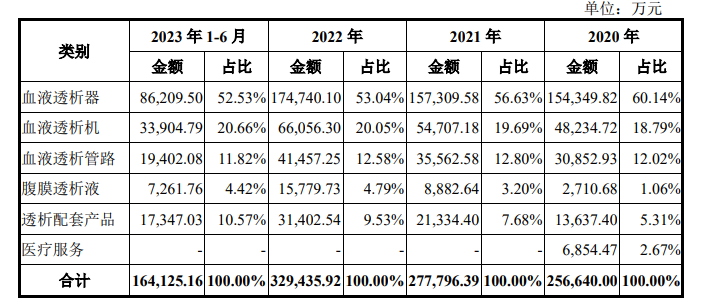 从招股说明书(申报稿,2023-12-30)中可看到,报告期各期,威高血净来自血液透析机及腹膜透析液的销售收入分别为5.09亿元、6.36亿元、8.18亿元和4.12亿元,分别占主营业务收入19.85%、22.89%、24.84%和25.08%。