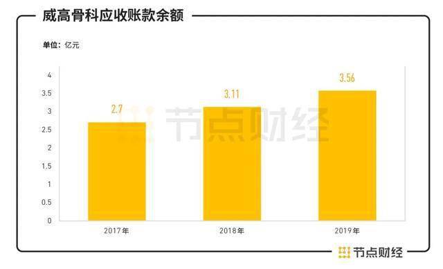 因此,在威高骨科营收增长的同时,同样连年上涨的还有应收账款余额。各年末分别为2.70亿元、3.11亿元和3.56亿元,占当期营业收入的比例约为二至三成。2018年及2019年应收账款余额较上一年分别上涨了15.27%和14.38%。应收帐款规模扩大,使得威高骨科未来有发生逾期、坏账或回收周期变长等风险,影响其盈利能力。