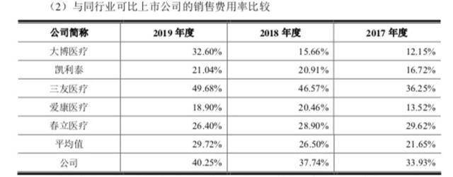 招股说明书显示,2017至2019年,威高骨科销售费用率分别为33.93%、37.74%、40.25%,显著高于行业平均水平21.65%、26.50%、29.72%,且逐年上升。对此,威高骨科解释称这是因为“配送模式下公司承担了术前咨询、跟台指导、清洗消毒等商务服务成本。”