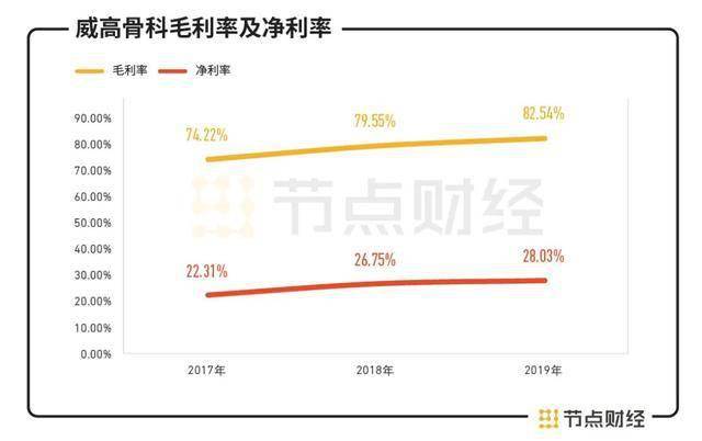 2017至2019年,威高骨科主营业务毛利率分别为 74.22%、79.55%和 82.54%,毛利率较高且呈增长趋势,具有较强盈利能力。