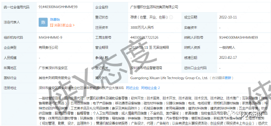 据平台推广资料介绍“禧积分”的主体经营公司为广东禧积分生活科技集团有限公司。经查,该公司成立于2022年10月11日,法定代表人为陈嘉怡,监事为林桂兰,大股东为深圳禧多多投资合伙企业(有限合伙)(持股99%),小股东陈嘉怡(持股1%),注册资本3000万元,实缴0元,参保人数0人。