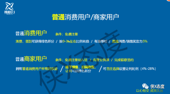 普通商家用户.有营业执照并且完成银联签约即可成为普通商家用户,线下销售扫码收款让利可以获得让利等值的绿色积分(让利比例可自主选择4%-28%)。