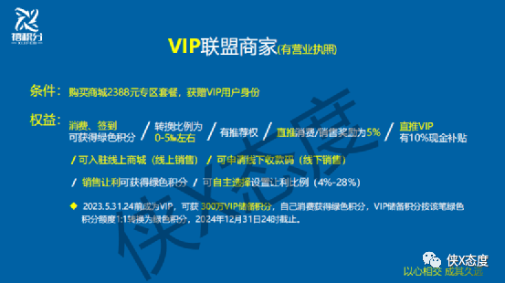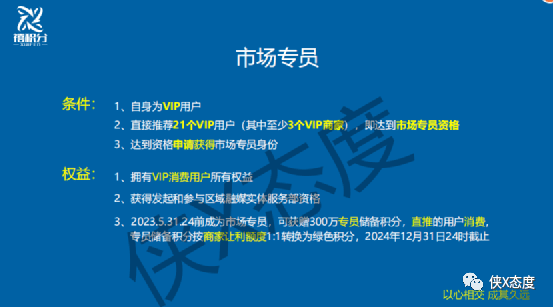 同时,当成为VIP用户后,直推21个VIP用户(其中至少3个VIP商家)则可申请成为市场专员,可以获得发起和参与区域融媒实体服务部资格,以及2023.5.31.24前成为市场专员,可获赠300万专员储备积分,直推的用户消费,专员储备积分按商家让利额度1:1转换为绿色积分,2024年12月31日24时截止。