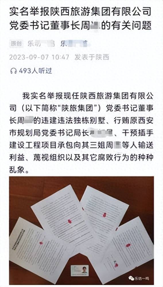 近日,陕西旅游集团有限公司(以下简称“陕旅集团”)一职工在网络实名举报该公司党委书记、董事长周某,举报信中称周某存在居住独栋别墅、行贿官员、干预插手建设工程项目承包等腐败行为。9月11日,陕西省纪委监委工作人员告诉奔流新闻记者,已经注意到网上举报。
