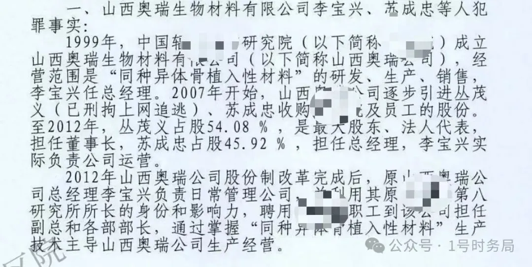 2007年开始,山西奥瑞公司逐步引进丛茂义(已刑拘上网追逃)、苏成忠收购中国某某研究院及员工的股份。至2012年,丛茂义占股54.08%,是最大股东、法人代表,担任董事长,苏成忠占股45.92%,担任总经理,李宝兴实际负责公司运营。