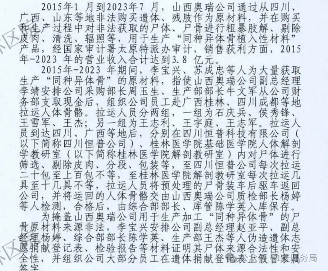 细节显示,2015年1月到2023年7月,李宝兴、苏成忠等人为大量获取生产“同种异体骨”的原材料,开始指示山西奥瑞公司通过从四川、广西、山东等地非法购买遗体、残肢作为原材料,并在购买和生产过程中对非法获取的尸体、尸骨进行粗暴肢解、剔除皮肉、清洗、辐照等,用于生产“同种异体骨植入性材料”产品。