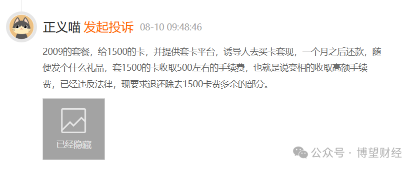 同日,投诉编号为17375064715的用户称,2009的套餐给1500的卡,并提供套卡平台,诱导人去买卡套现,一个月之后还款,随便发个什么礼品,套1500的卡收取500左右的手续费,也就是说变相的收取高额手续费,已经违反法律,现要求退还除去1500卡费多余的部分。
