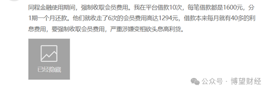 比如8月10日,投诉编号为17374977956的用户称,在使用同程金融期间,强制收取会员费用,在平台借款10次,每笔借款都是1600元,分1期一个月还款。总共6次收走的收走的会员费用就高达1294元。