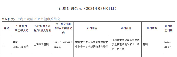 2月初的处罚刚刚过,2月底上海雍禾医院又被黄浦区卫健委处以警告处罚,处罚事由是因为实验室工作人员未遵守实验室生物安全技术规范和操作规程。