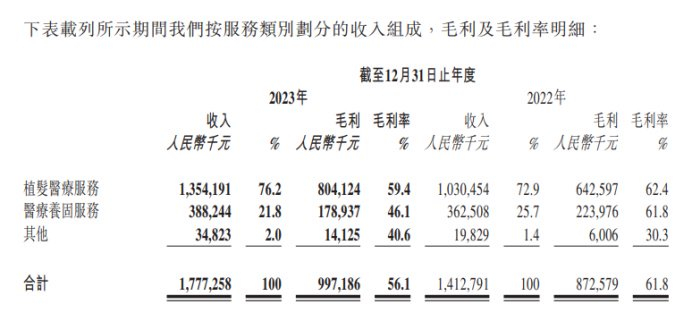 如果拆解一下雍禾医疗的具体业务结构,作者发现其植发医疗服务和医疗养固服务的盈利水平均出现了下滑,毛利率分别从2022年的62.1%、61.8%下降到了2023年的59.4%、46.1%。