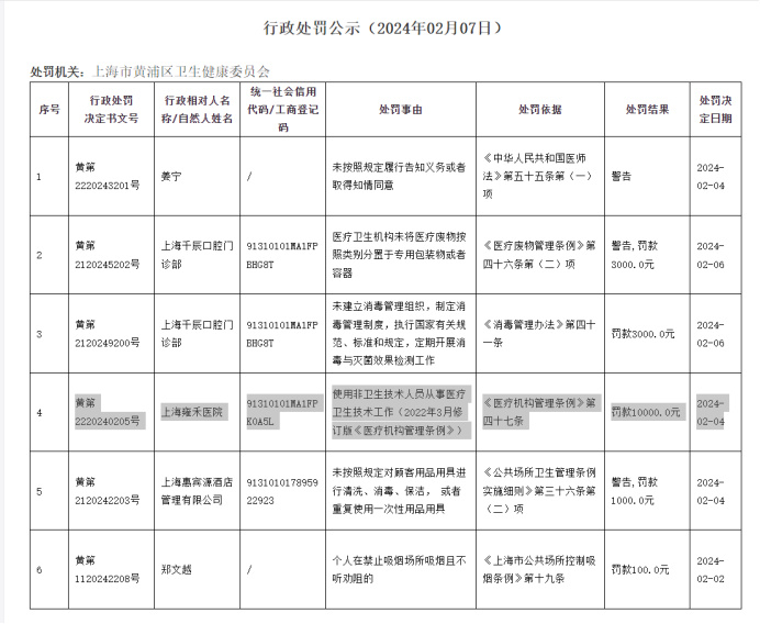 这份由上海市黄浦区卫生健康委员会2024年2月4日发布的行政处罚公示显示,雍禾医疗旗下的上海雍禾医院因“使用非卫生技术人员从事医疗卫生技术工作”,违反了《医疗机构管理条例》第47条,被罚款1万元。