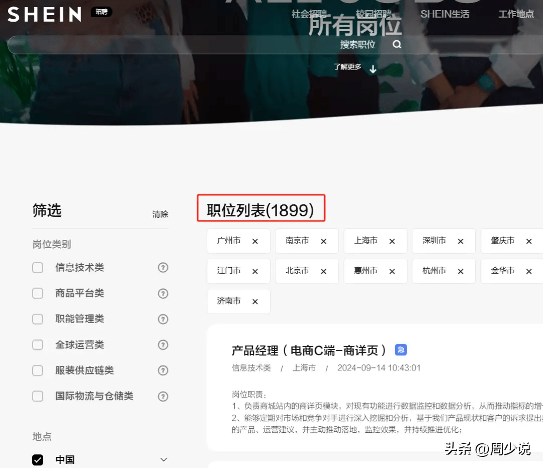 从员工人数上来看,SHEIN在国内主主体公司员工人数在1.6万以上,在新加坡总部却仅有数百员工。SHEIN官网信息显示,该公司9月份在招岗位2054个,其中中国岗位1899个,占比超92%,总部所在地新加坡招聘岗位仅10个,占比0.5%。