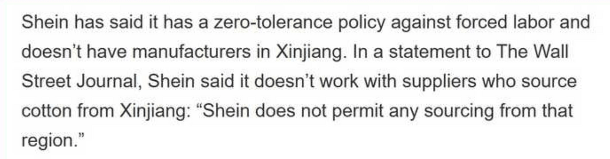 然而SHEIN却在给《华尔街日报》的声明中表示,自己对“强迫劳动”采取“零容忍”政策,将不再与从新疆采购棉花的供应商合作,“SHEIN不允许从该地区采购”。