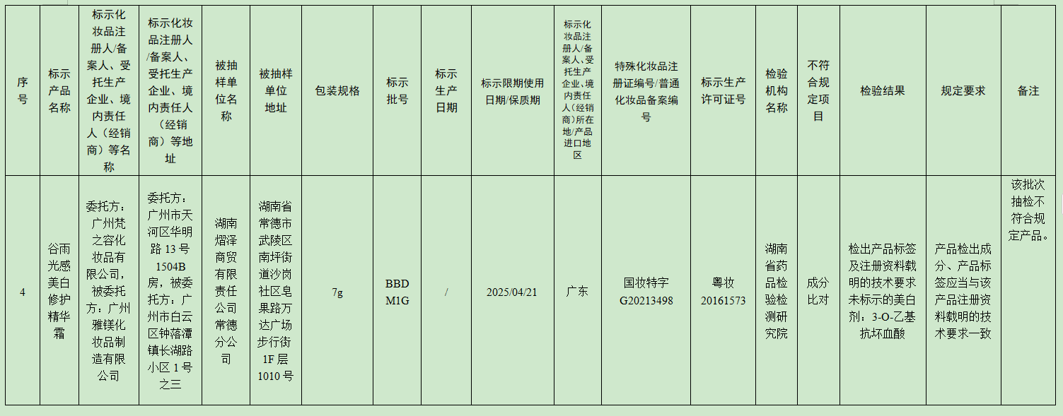 序号5的产品也是谷雨光感美白修护精华霜,只不过包装规格为7g,批次为BBDM1G,购买地为:湖南省常德市武陵区南坪街道沙岗社区皂果路万达广场步行街1F层1010号,检验机构为湖南省药品检验检测研究院,检测结果为检出产品标签及注册资料载明的技术要求未标示的美白剂:3-O-乙基抗坏血酸,产品检出成分、产品标签未与该产品注册资料载明的技术要求一致。