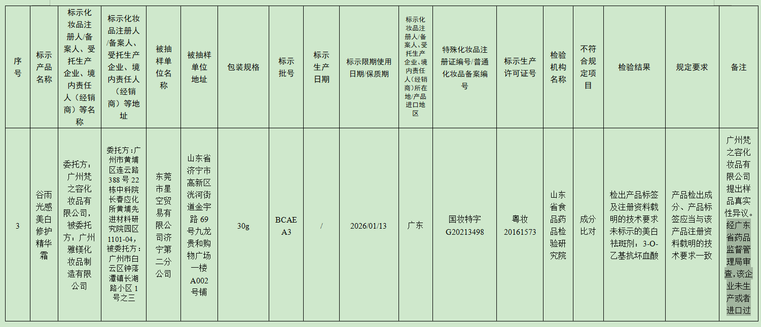 今年7月,国家药监局公布了36批次不符合规定化妆品的通告,其中涉及标称由广州梵之容化妆品有限公司委托生产的30g“谷雨光感美白修护精华霜”(批次:BCAEA3,购买地为:山东省济宁市高新区洸河街道金宇路69号九龙贵和购物广场一楼A002号铺,公告序号4),被山东省食品药品检验研究院检出成分比对项目不合格。但广州梵之容化妆品有限公司提出样品真实性异议,经广东省药品监督管理局审查,该企业未生产或者进口过该批次抽检不符合规定产品。谷雨相关负责人表示,被抽检的产品为假货。