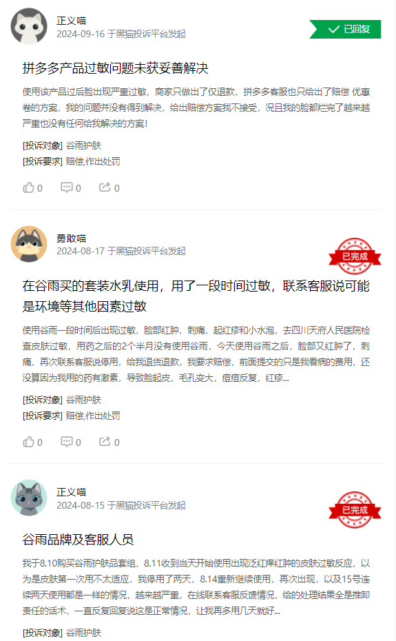 然而,尽管谷雨品牌方面作出了积极回应,但并未召回不合格产品,也未对公开道歉。而此次事件仍然对谷雨化妆品的品牌形象和消费者信任度造成了一定的冲击。许多消费者对谷雨化妆品的真假及质量产生了疑虑,网络上关于产品真假的讨论也愈发激烈。在黑猫投诉平台,还有多个消费者对谷雨化妆品进行了投诉。