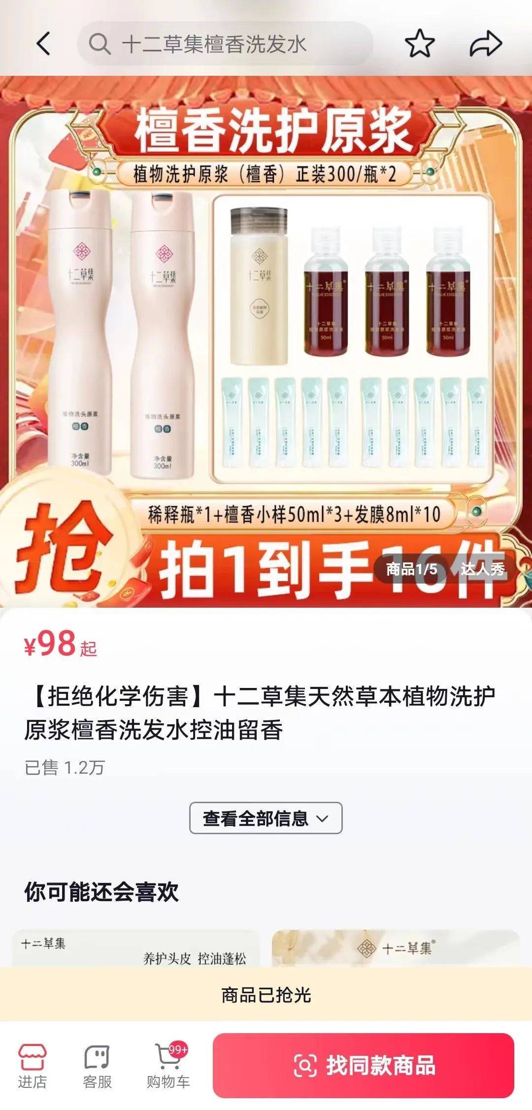 据十二草集官方旗舰店直播平台店铺信息,销量最好的产品为十二草集植物洗头原浆-檀香,目前显示销量1.2万件,单瓶售价为98元,两瓶装售价139元,截至目前销量为16.9万。