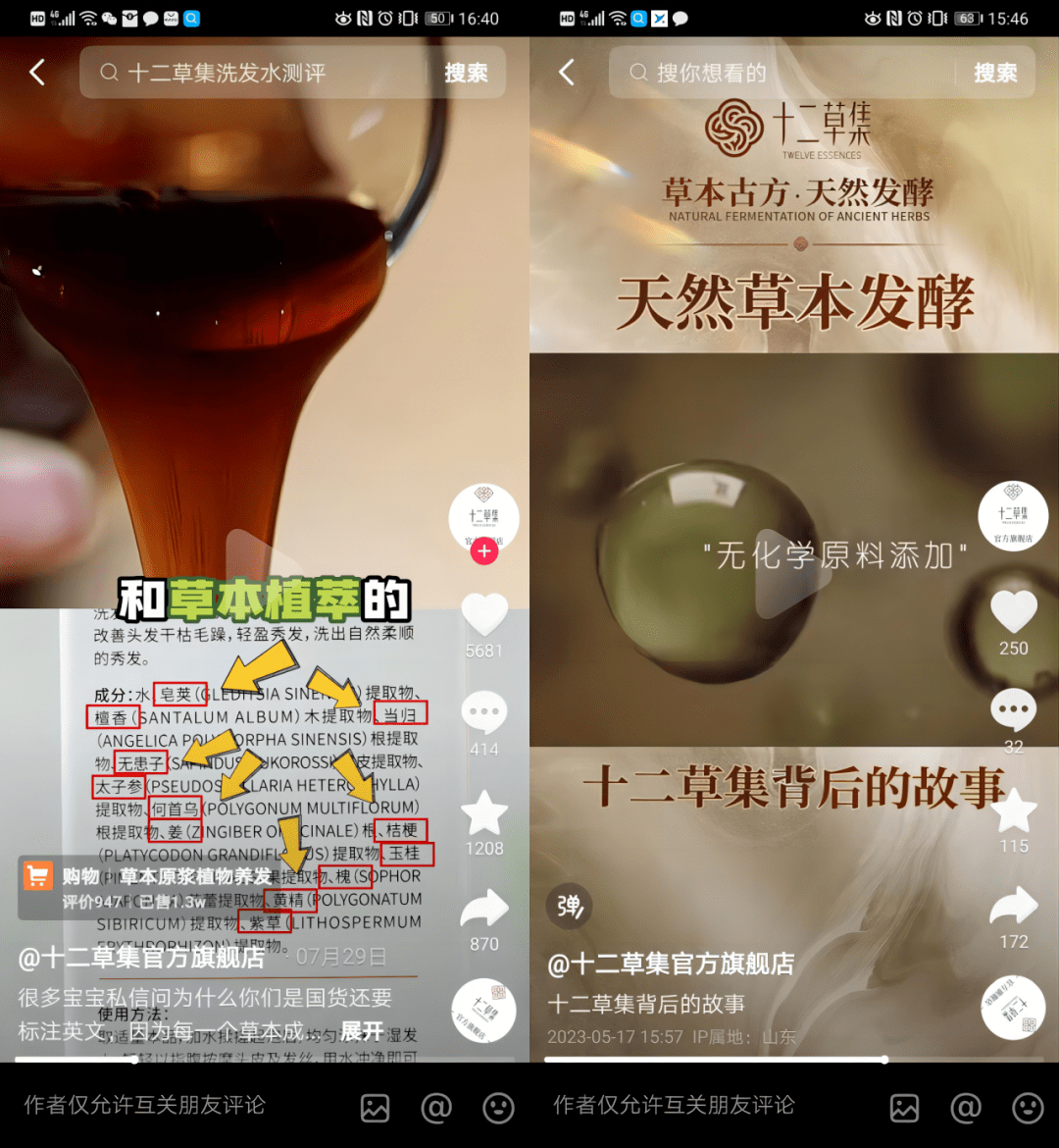 自今年5月起,十二草集官方旗舰店直播平台账号中接连发布100余条宣传短视频,其中许多宣传用语均涉及“配料表只有水和草本植萃”“无化学原料添加”等。
