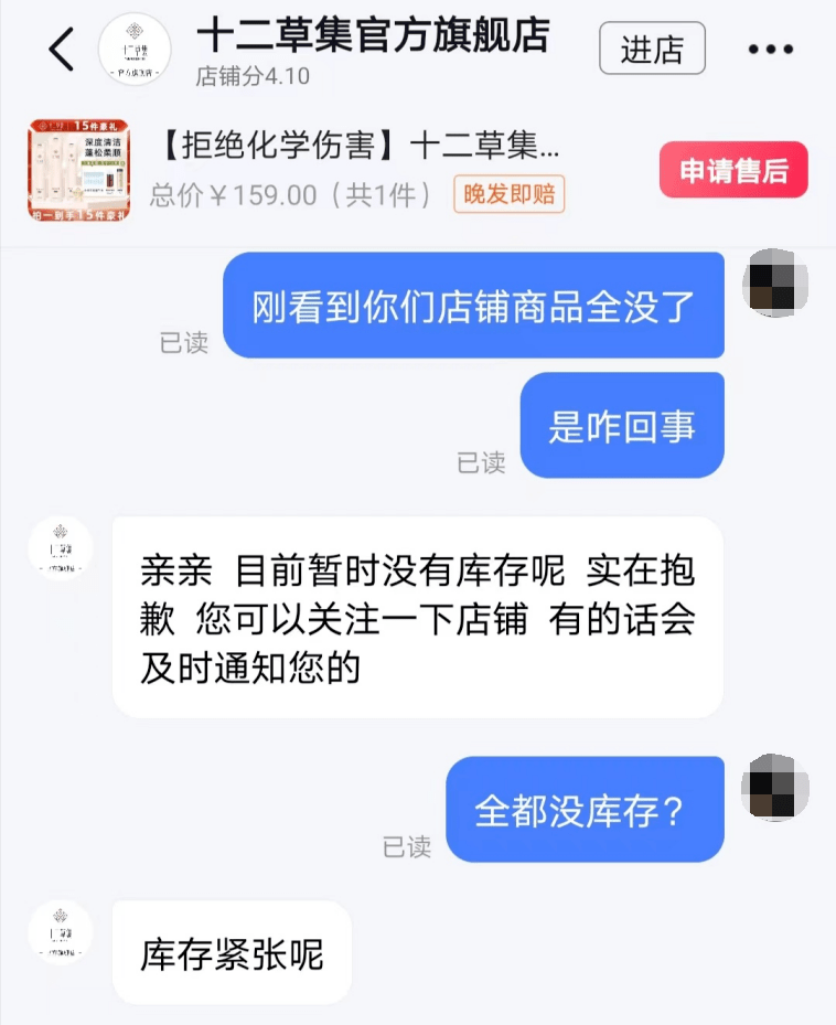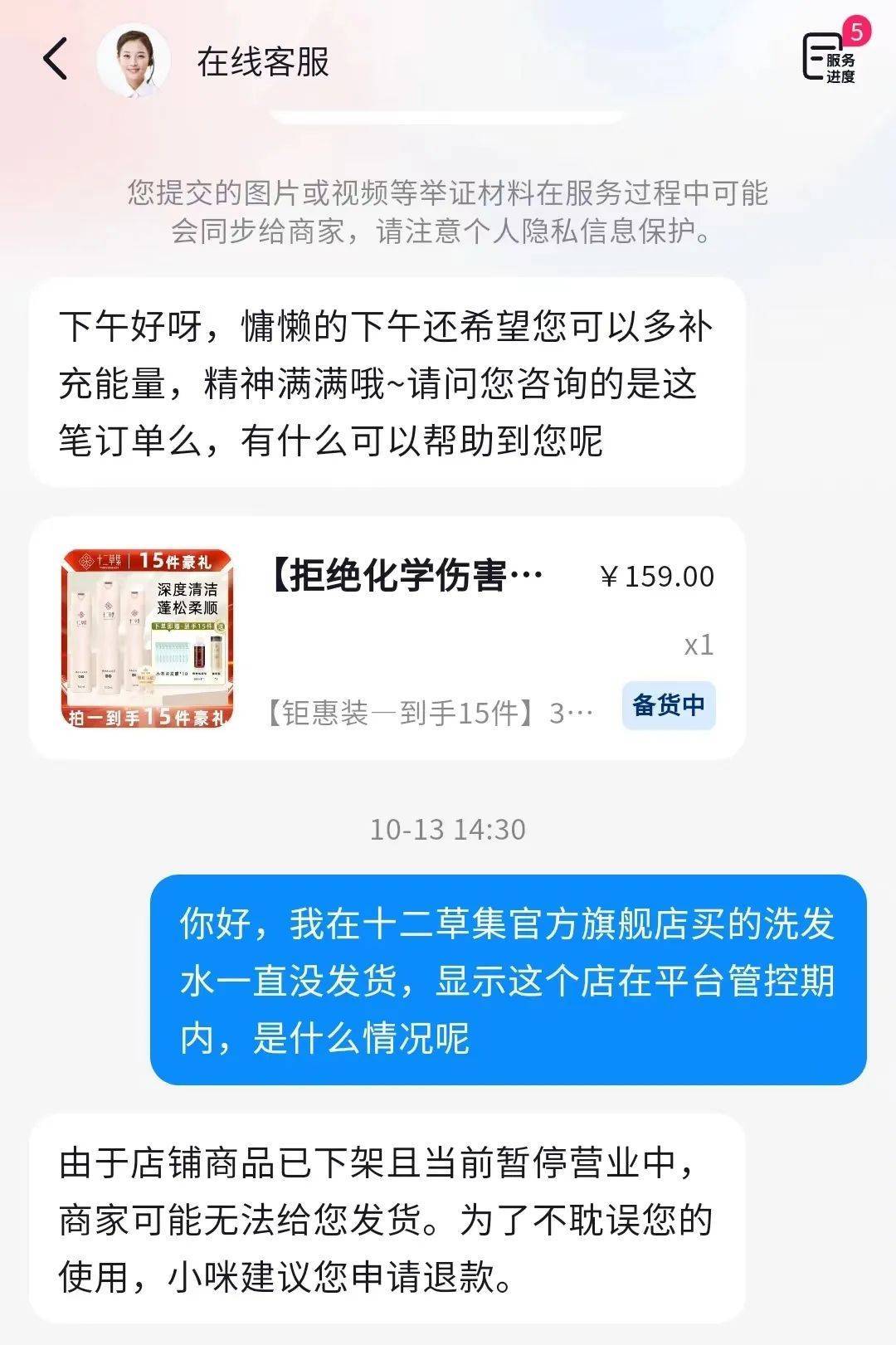 针对全部商品下架情况,消费者报道咨询十二草集商家原因,客服回复称是因为“目前暂时没有库存”。而当问起为何处于“平台管控期”时,客服回复表示不清楚。