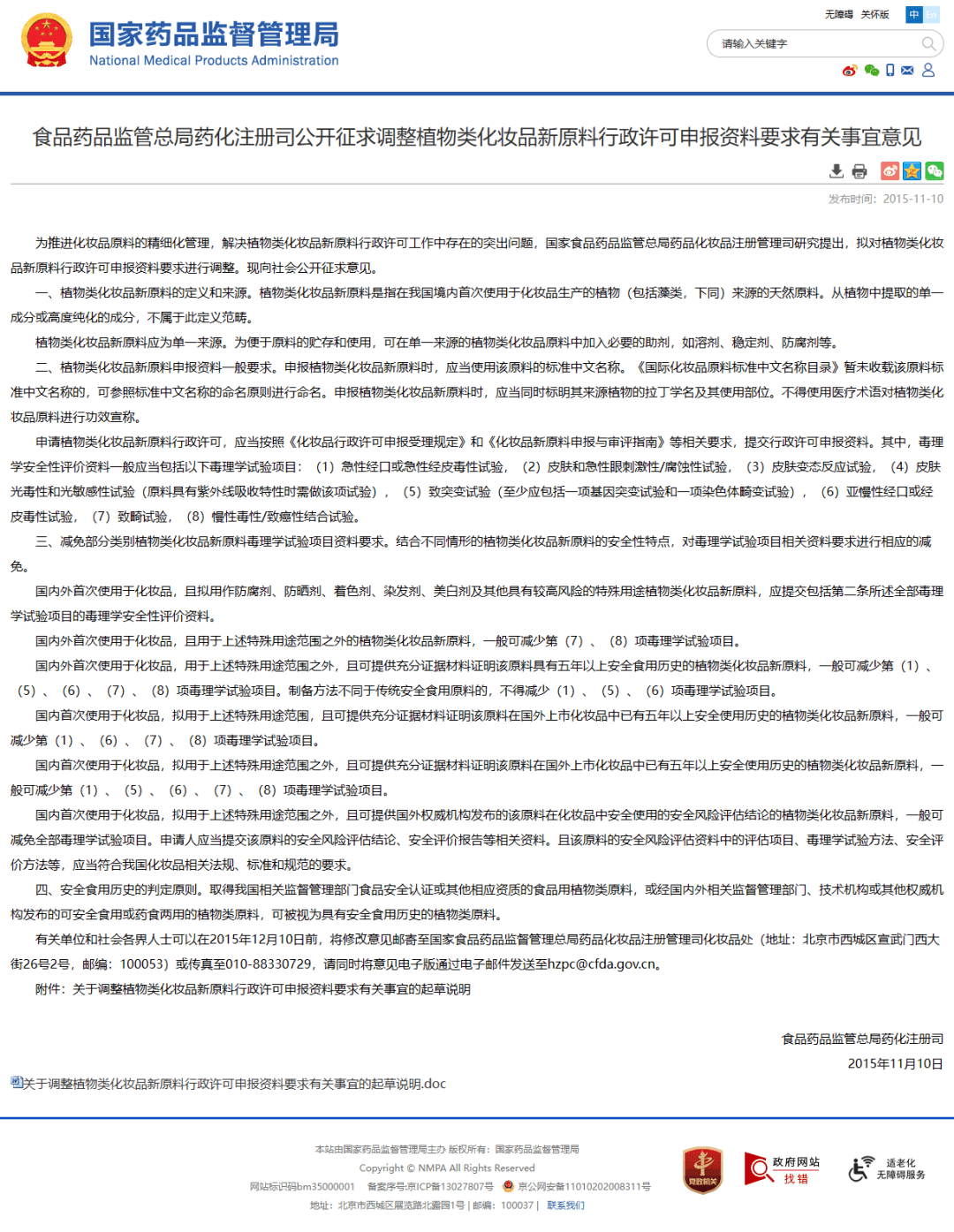 不仅如此,《食品药品监管总局药化注册司公开征求调整植物类化妆品新原料行政许可申报资料要求有关事宜意见》还在征求意见阶段,自2015年发布至今,并未确定实施,不能作为正式文件为相关企业使用。