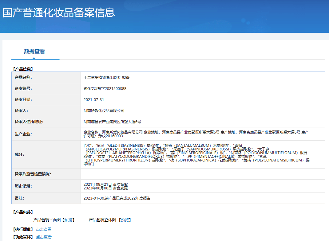 根据《消费者报道》查询到的该产品备案信息,产品名称为“十二草集植物洗头原浆-檀香”,备案人及生产企业为河南所爱化妆品有限公司,备案日期为2021年7月31日,其备案成分与产品包装标示的相同,排名第一位的为水,其余均为各类植物提取物。