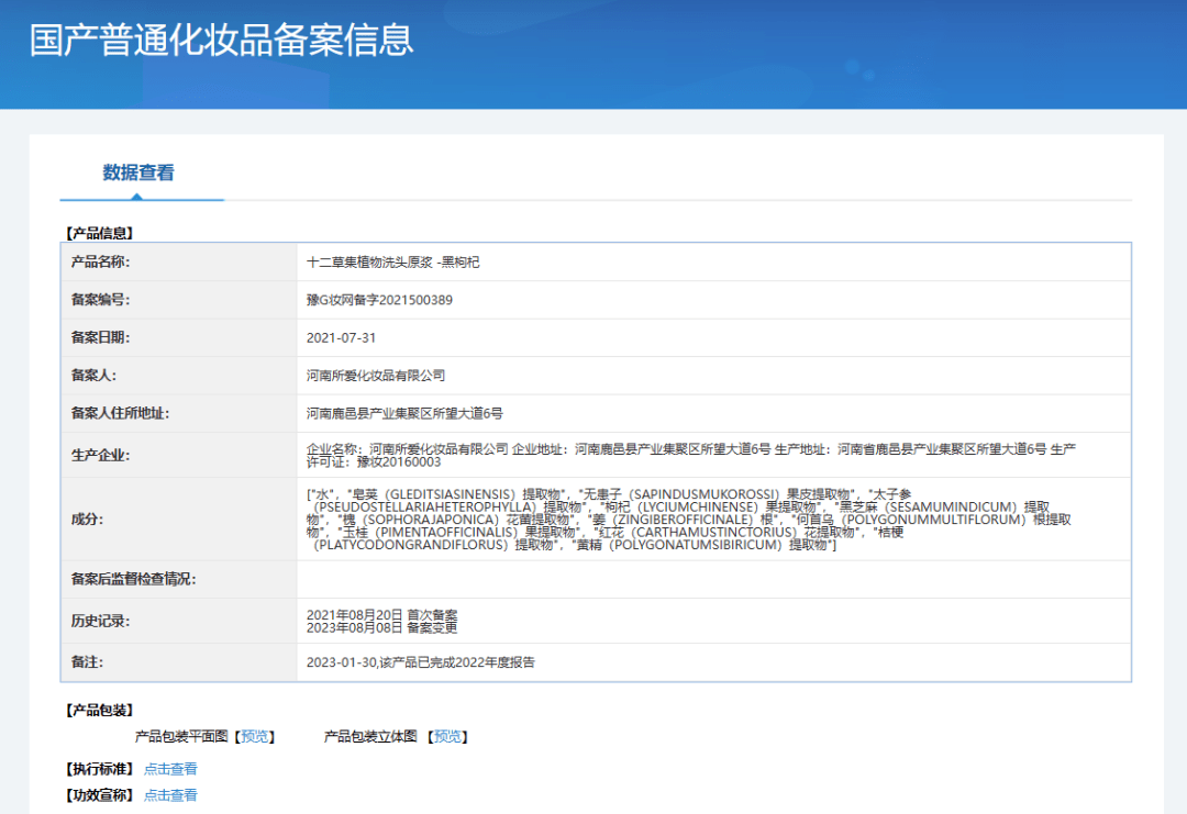 十二草集植物洗头原浆-黑枸杞备案信息(图片源自国家药品监督管理局)