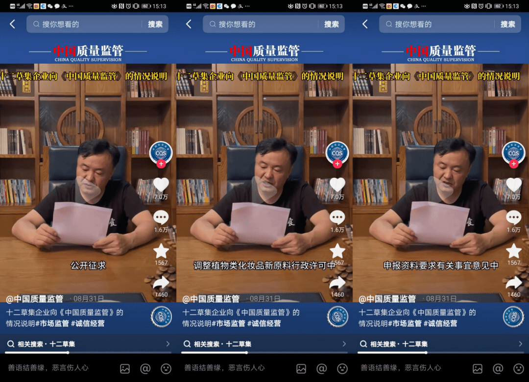 在发生“打假”事件后,十二草集品牌生产厂家河南所爱化妆品有限公司于8月31日通过中国质量监管直播平台官方账号做出回应。