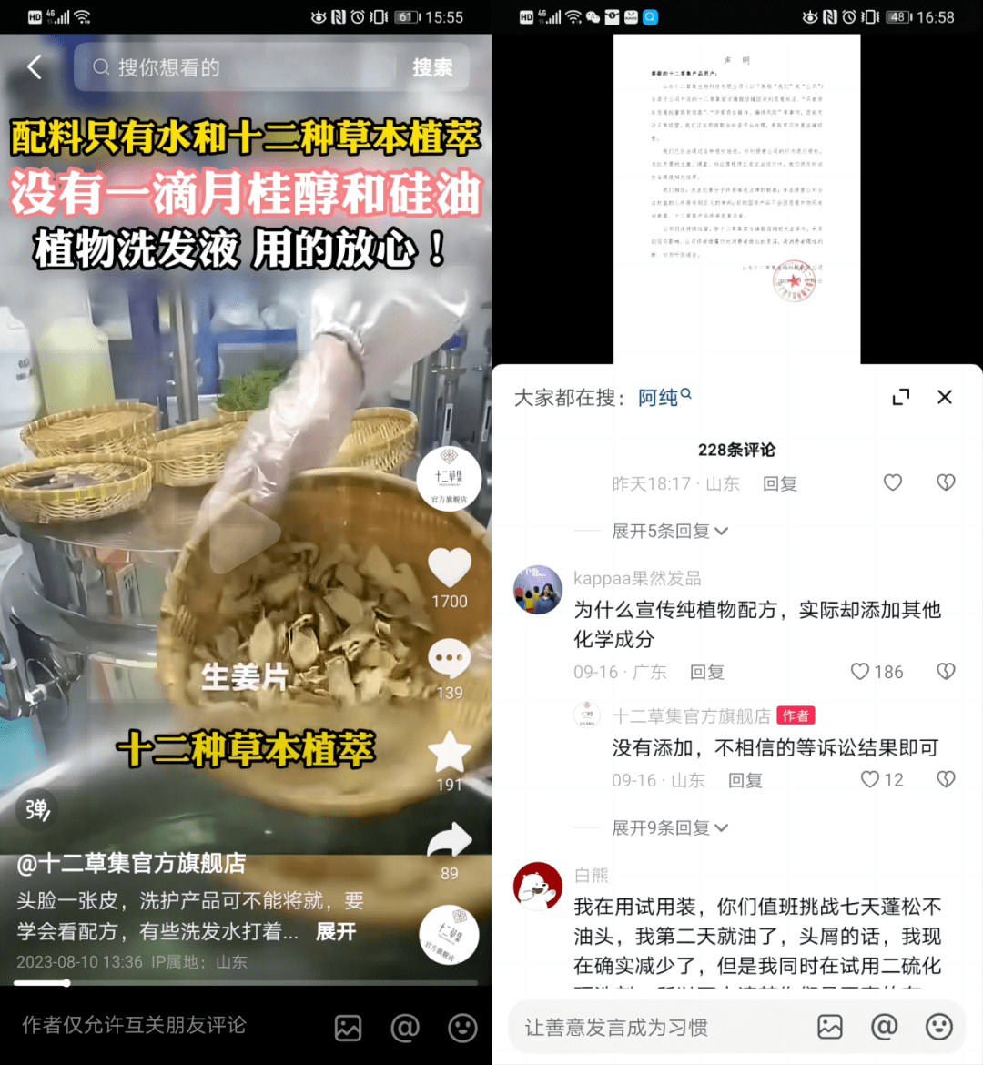 近期,有一款十二草集洗头原浆在直播平台上销量暴增,这款洗发水打着“配料表除了水就是草本植萃”“没有科技与狠活”的卖点迅速蹿红。