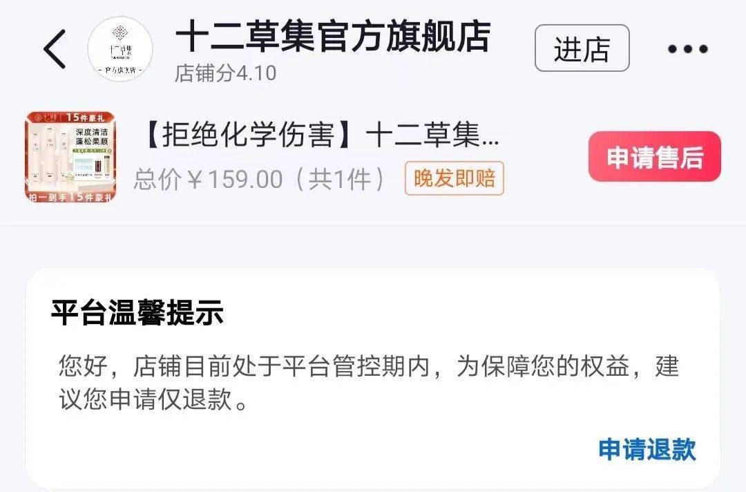 10月13日,消费者报道发现十二草集直播平台官方旗舰店内所有商品全部下架,店铺处于“平台管控期内”。