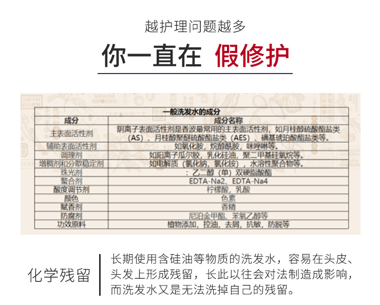 这一新增的产品配方,与商家此前“唾弃”的一般洗发水充满“科技与狠活”的配方表几无二致。