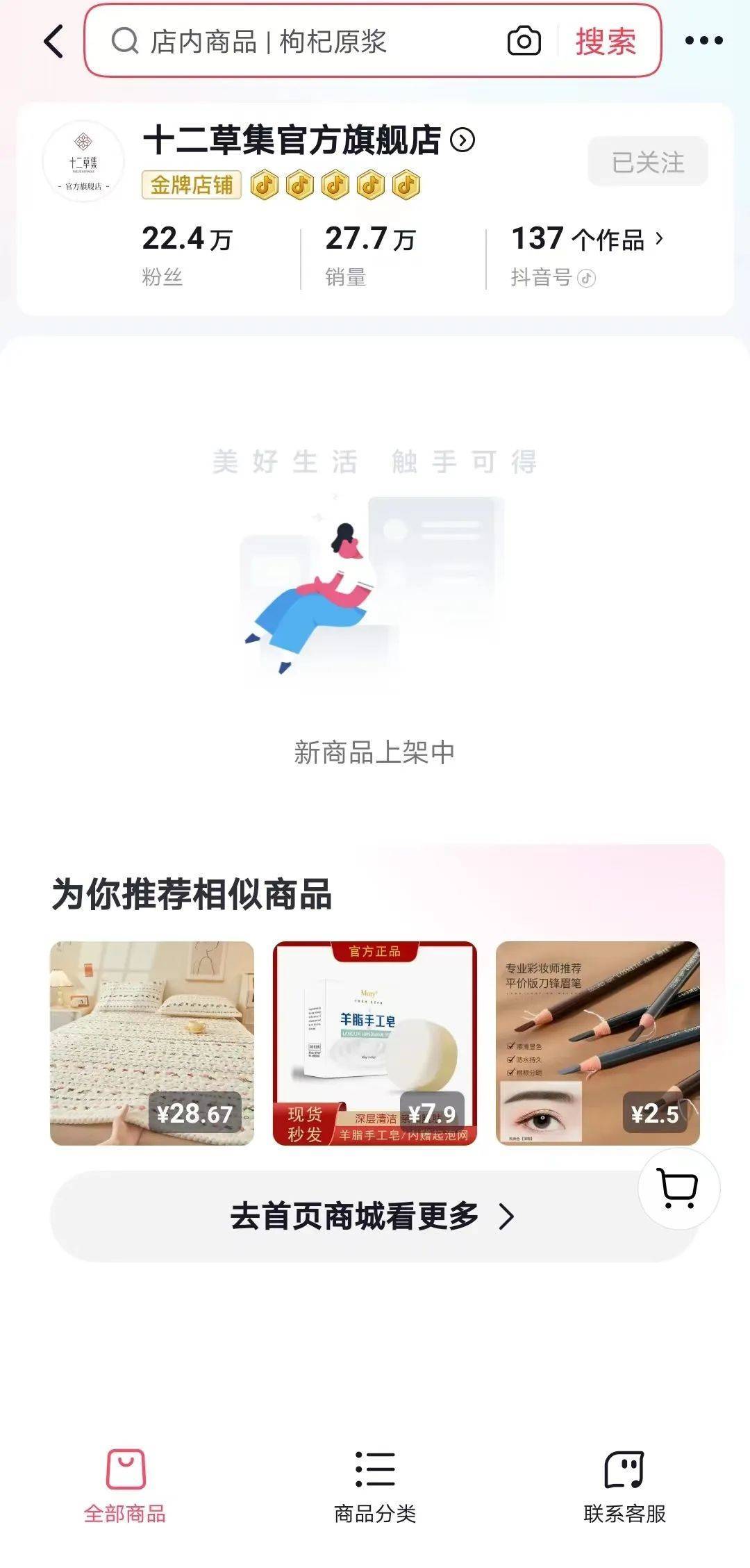 10月15日,当消费者报道再度查看十二草集直播平台官方旗舰店页面,发现已有部分商品重新上架,但所有涉及“十二草集植物洗头原浆”的产品仍然是下架状态。