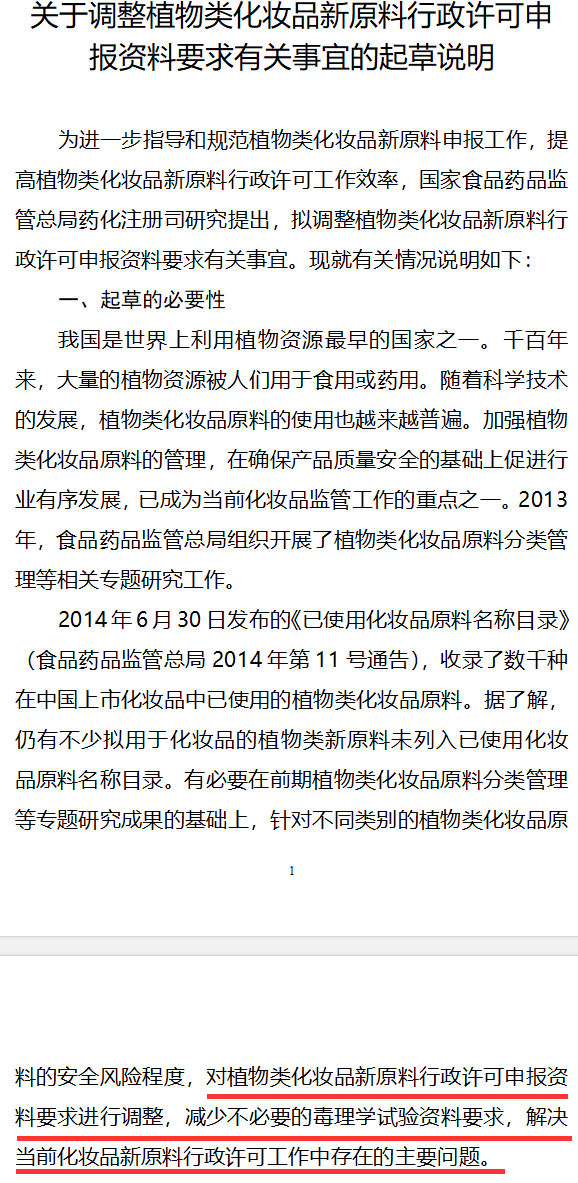 此外,根据“意见”的附件“关于调整植物类化妆品新原料行政许可申报资料要求有关事宜的起草说明”,起草上述内容的必要性在于“减少不必要的毒理学试验资料要求,解决当前化妆品新原料行政许可工作中存在的主要问题。”工作原则和主要目标为“对安全性相对较高的类别,适当减免一些不必要的毒理学试验项目,从而进一步提高植物类化妆品新原料行政许可工作效率。”并不涉及“注册成分表中表明植物(植物名称)提取物即可”相关内容。