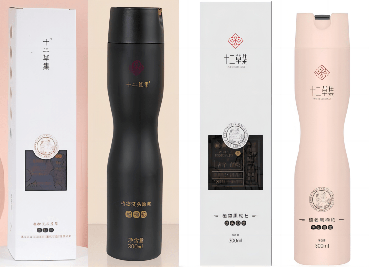 在产品图片方面,“十二草集植物黑枸杞洗头原浆”与“十二草集植物洗头原浆-黑枸杞”两款产品,外包装盒类似,包装瓶则由黑色变为肉粉色。