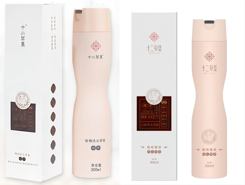 “十二草集植物檀香洗头原浆”与“十二草集植物洗头原浆-檀香”两款产品,除了产品名称有极高的相似度,二者的产品图片也雷同。