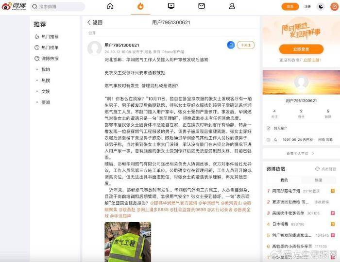 邯郸市居民张女士因身体不适独自在家,正在换衣时听到客厅有动静,转身一看发现一位身穿燃气工程服装的男子,该男子被发现后撒腿就跑。张女士穿好衣服后追至楼下未见男子踪影。随后通过华润燃气其他工作人员找到该男子,该男子称,当时看到张女士家大门没锁,承认没有敲门在未经允许的情况下进入用户家一事。患有脑瘤的张女士受到惊吓后因无法忍受剧烈头疼,目前已就医。